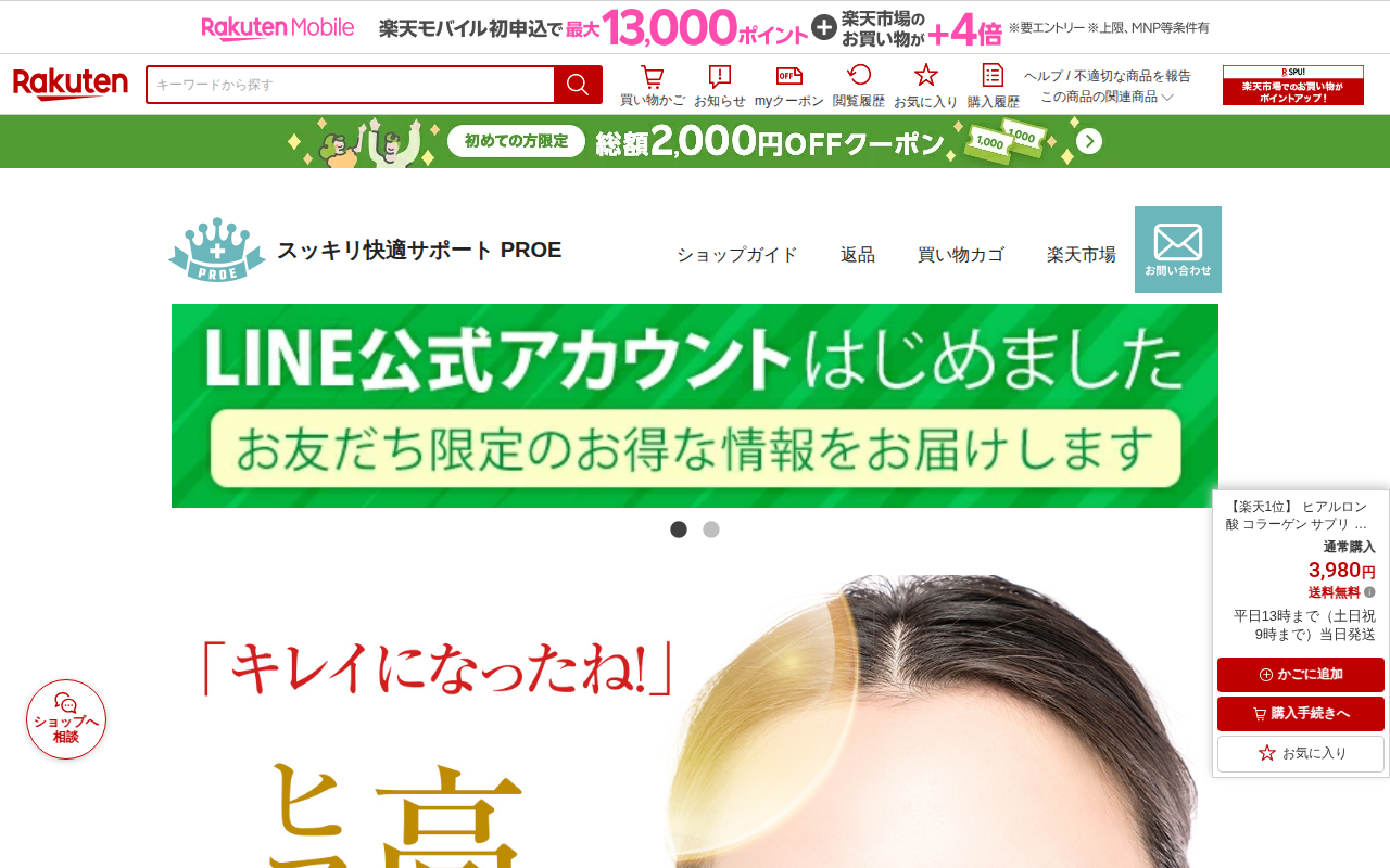 このページは、楽天市場で販売されているヒアルロン酸とコラーゲンを配合したサプリメント「ヒアル264」の商品ページです。高濃度の低分子ヒアルロン酸とコラーゲンペプチドを含む国産サプリで、乾燥肌対策や美容サポートを目的として...