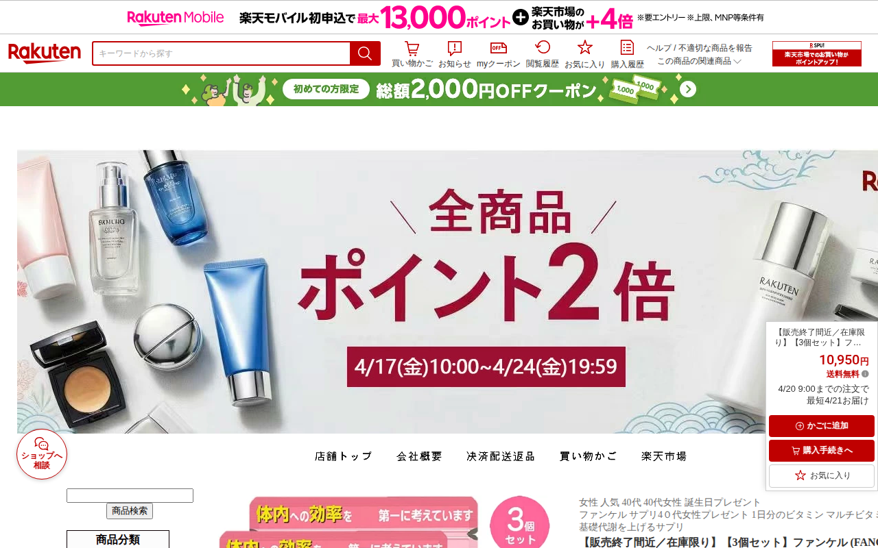 このページは、楽天市場で販売されているファンケルの「40代からのサプリメント女性用」3個セットの商品情報です。45~90日分で、40代女性の体の変化に対応した成分を配合しています。ビタミン、ミネラル、コラーゲン、コエンザ...