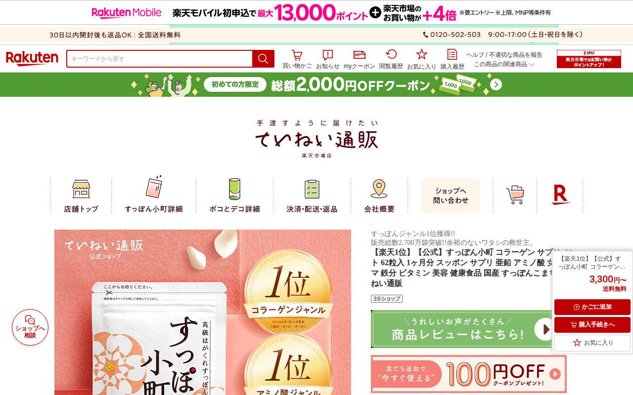 このページは、楽天市場で販売されている「すっぽん小町」というコラーゲンサプリメントの商品ページです。62粒入り1ヶ月分で、国産すっぽん使用。累計販売数2,700万袋突破、楽天ランキング1位獲得商品です。価格は1袋3,30...