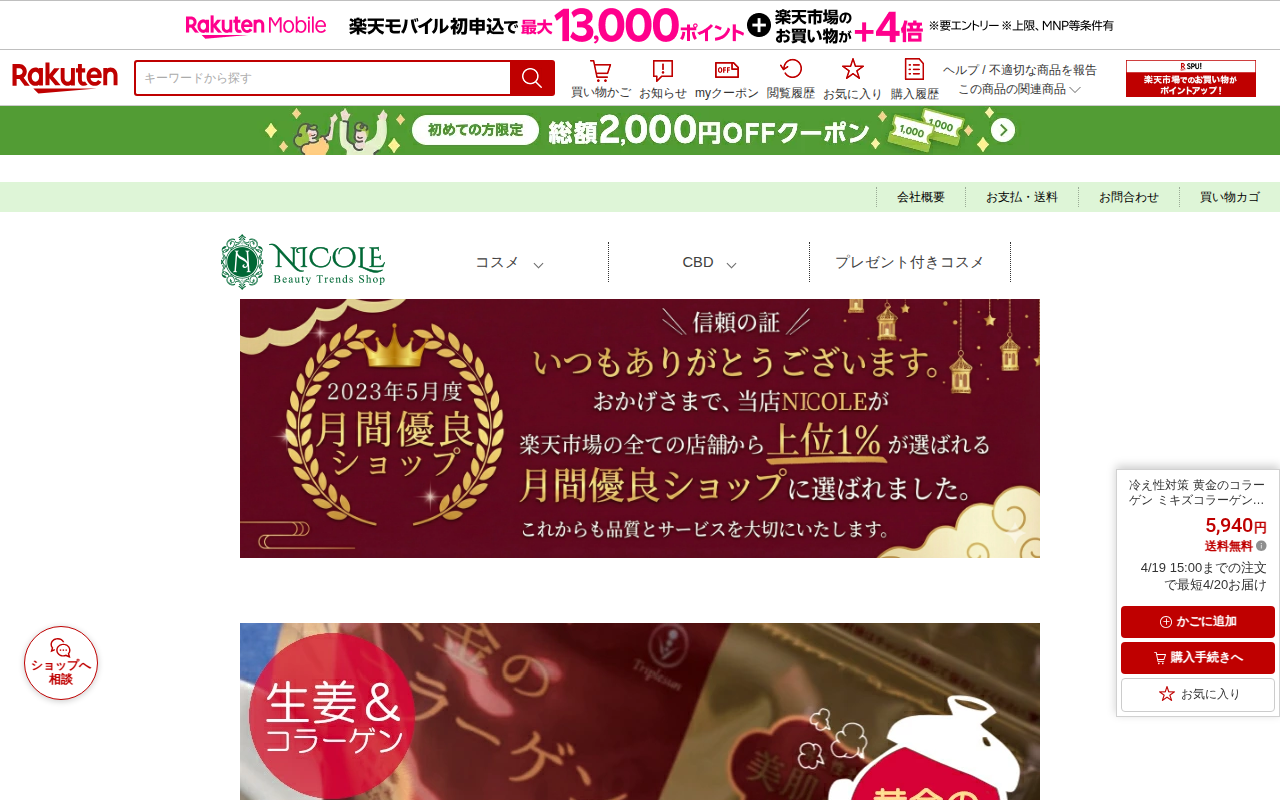 このページは、楽天市場で販売されている「黄金のコラーゲン ミキズコラーゲン」という健康補助食品の商品ページです。冷え性対策や身体を温めることを目的とした、生姜、ビタミンC、高麗人参を配合したコラーゲンパウダー(180g)...
