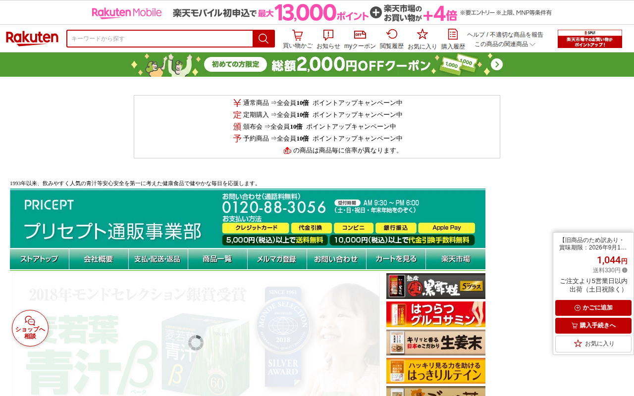 このページは、楽天市場で販売されているグルコサミンサプリメント「はつらつグルコサミン」の商品ページです。旧商品のため訳あり商品として、通常価格2,322円から1,044円に値下げされています。180粒入り、30日分で、ひ...