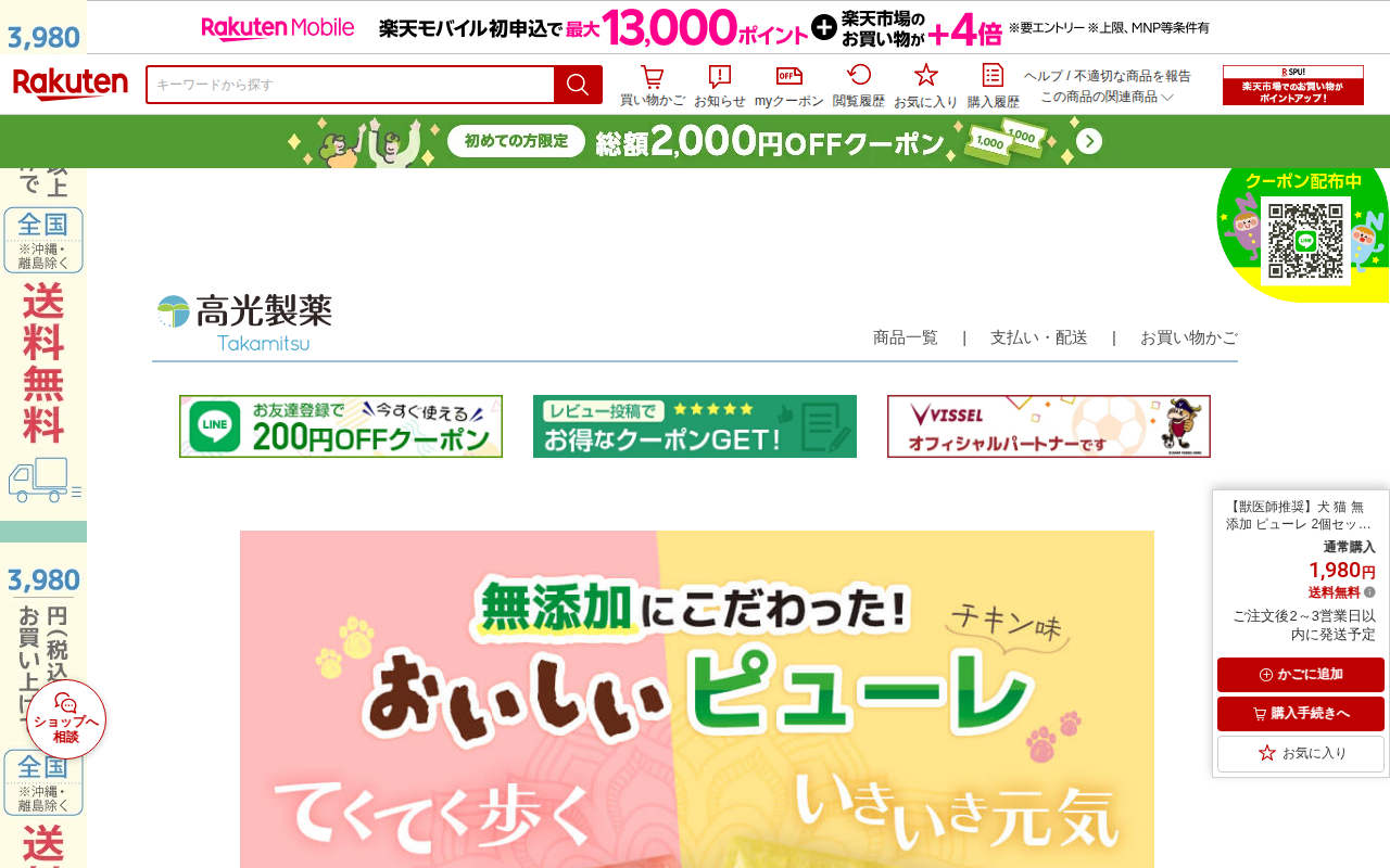 このページは、楽天市場で販売されている獣医師推奨の犬猫用無添加ピューレサプリメント2個セットの商品ページです。1,980円で送料無料。グルコサミン、コラーゲン、カルシウム、高麗人参、アガリクスなど、骨・関節・筋肉・免疫力...