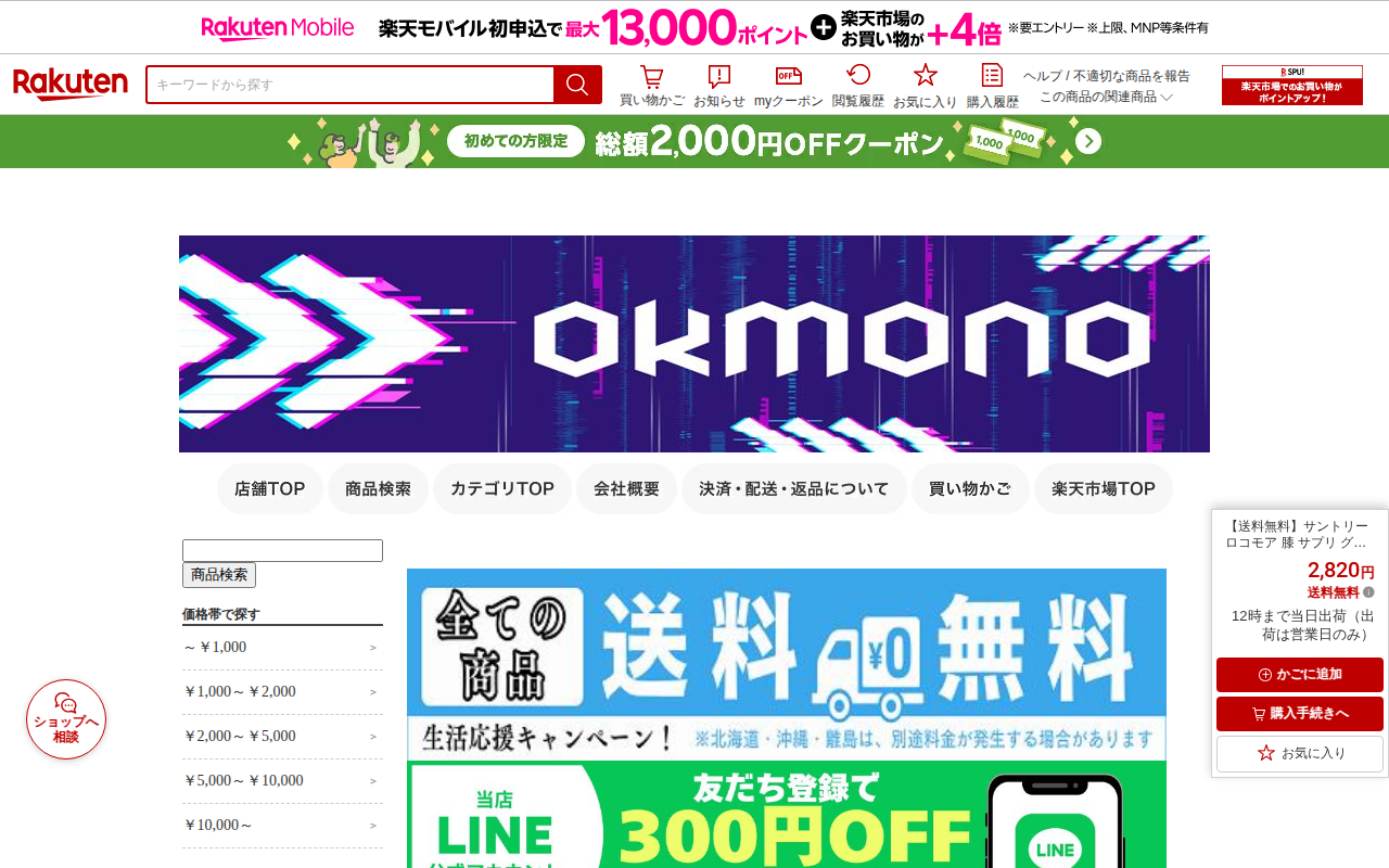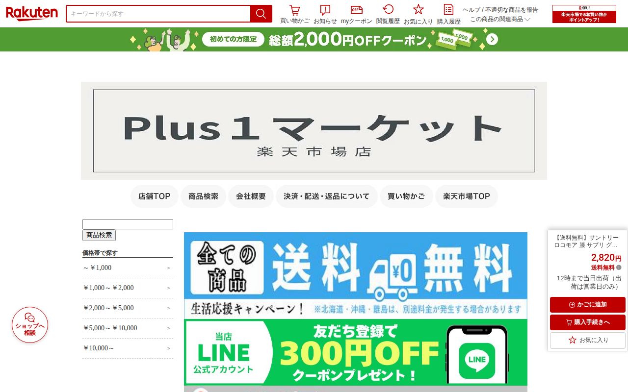 このページはサントリーのロコモアというサプリメント商品の販売ページです。膝関節と脚の筋力をサポートするため、グルコサミン、コンドロイチン、ケルセチンプラス、アンセリンの4つの成分を配合しています。価格は2,820円で送料...