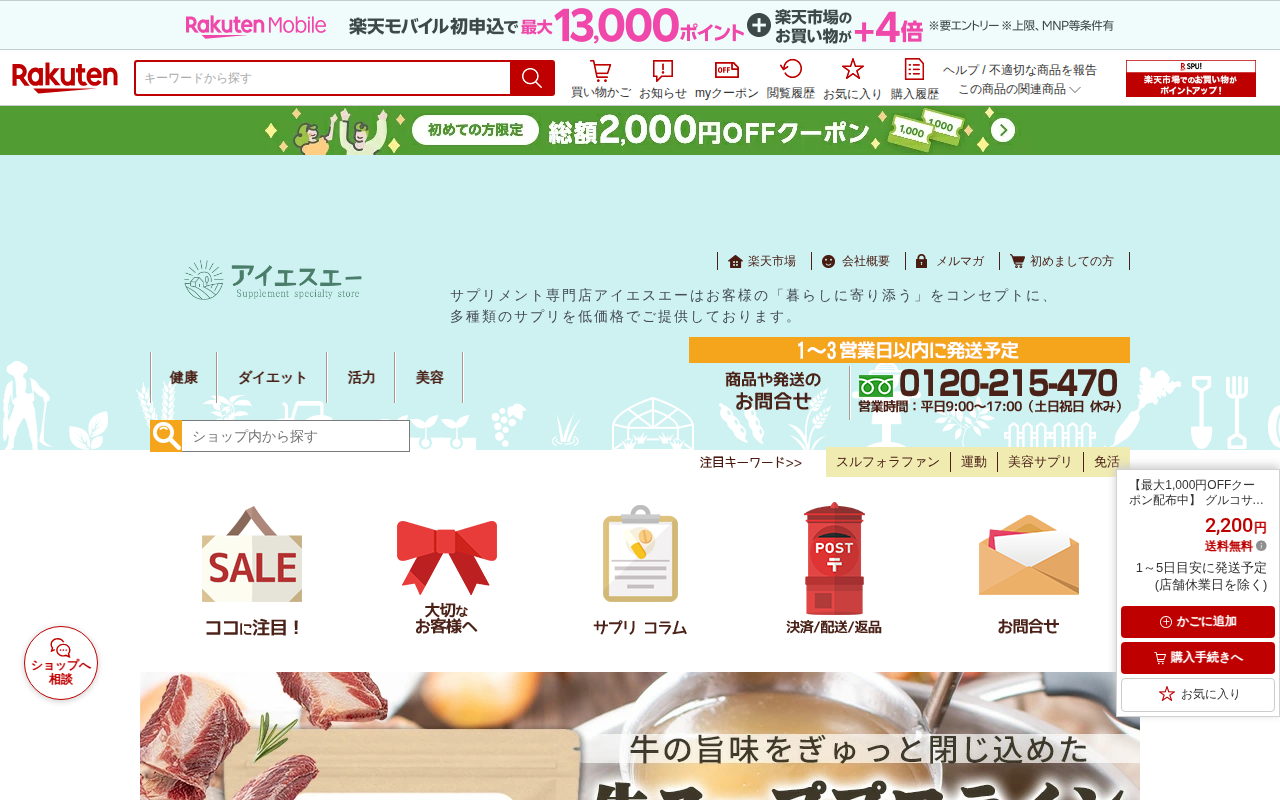このページは、楽天市場で販売されているリプサ製のグルコサミン+コンドロイチンサプリメント(T-723)の商品ページです。720粒で約3か月分、2,200円(送料無料)で、最大1,000円OFFクーポン配布中です。グルコサ...