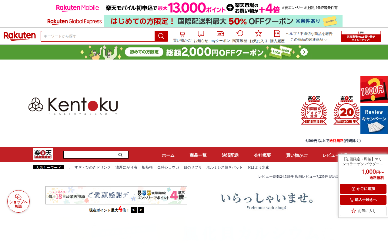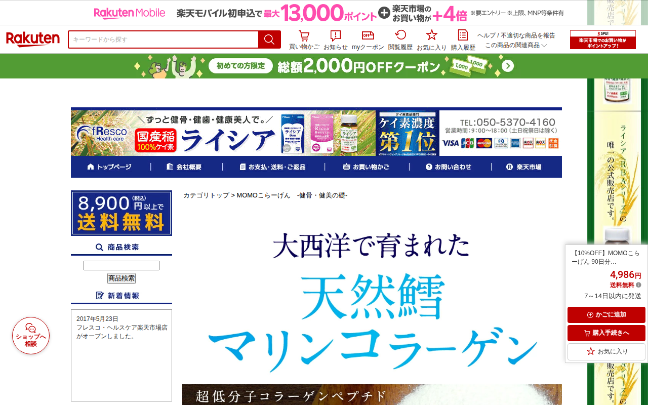 このページは、楽天市場で販売されている「MOMOこらーげん」という天然鱈を使用したフィッシュ・コラーゲンパウダーの商品紹介ページです。30日分で100,000mgのコラーゲンを含み、超低分子で吸収されやすいのが特徴です。...