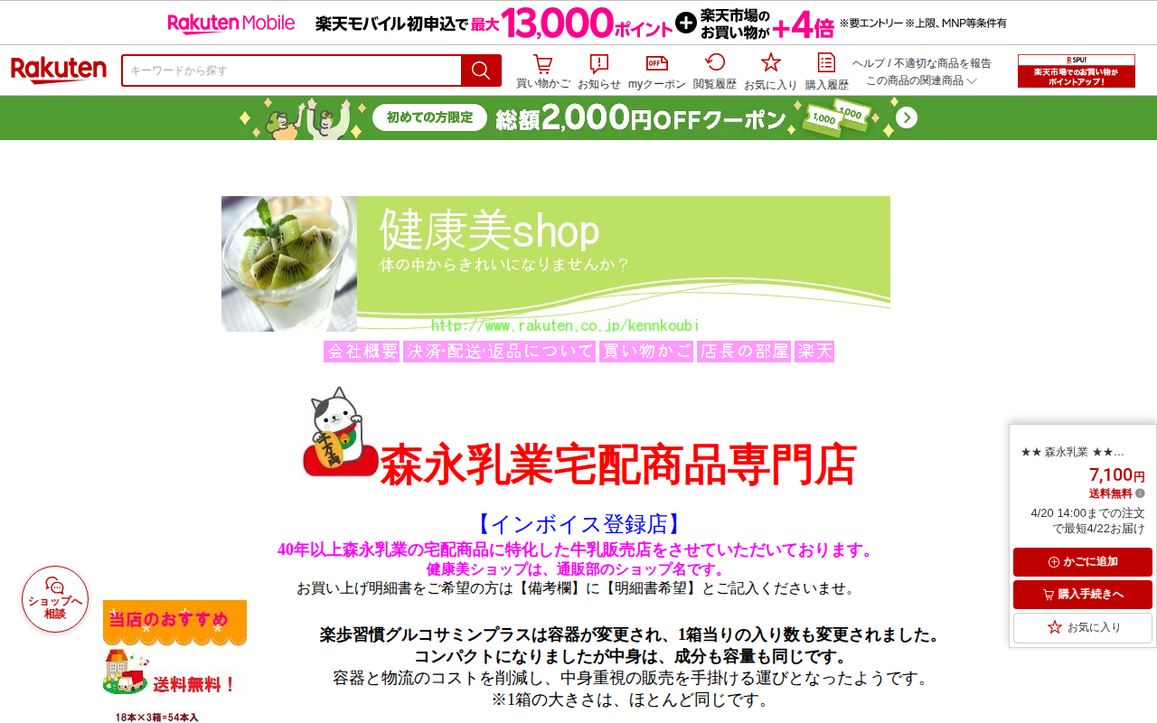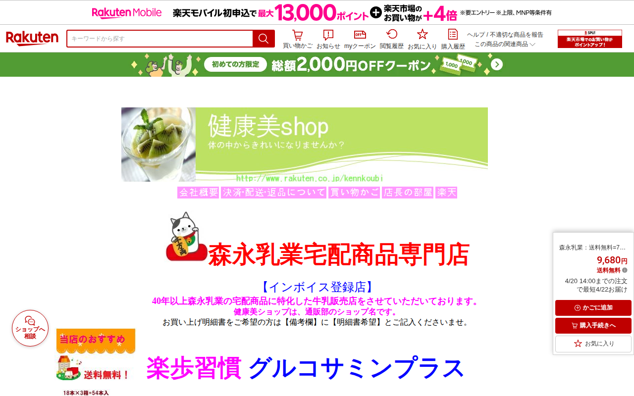 このページは、森永乳業の機能性表示食品「楽歩習慣 グルコサミンプラス」の販売ページです。N-アセチルグルコサミンとコラーゲンを配合したドリンクタイプで、2箱セット48本入り、送料無料で7,100円です。膝関節の悩み改善を...