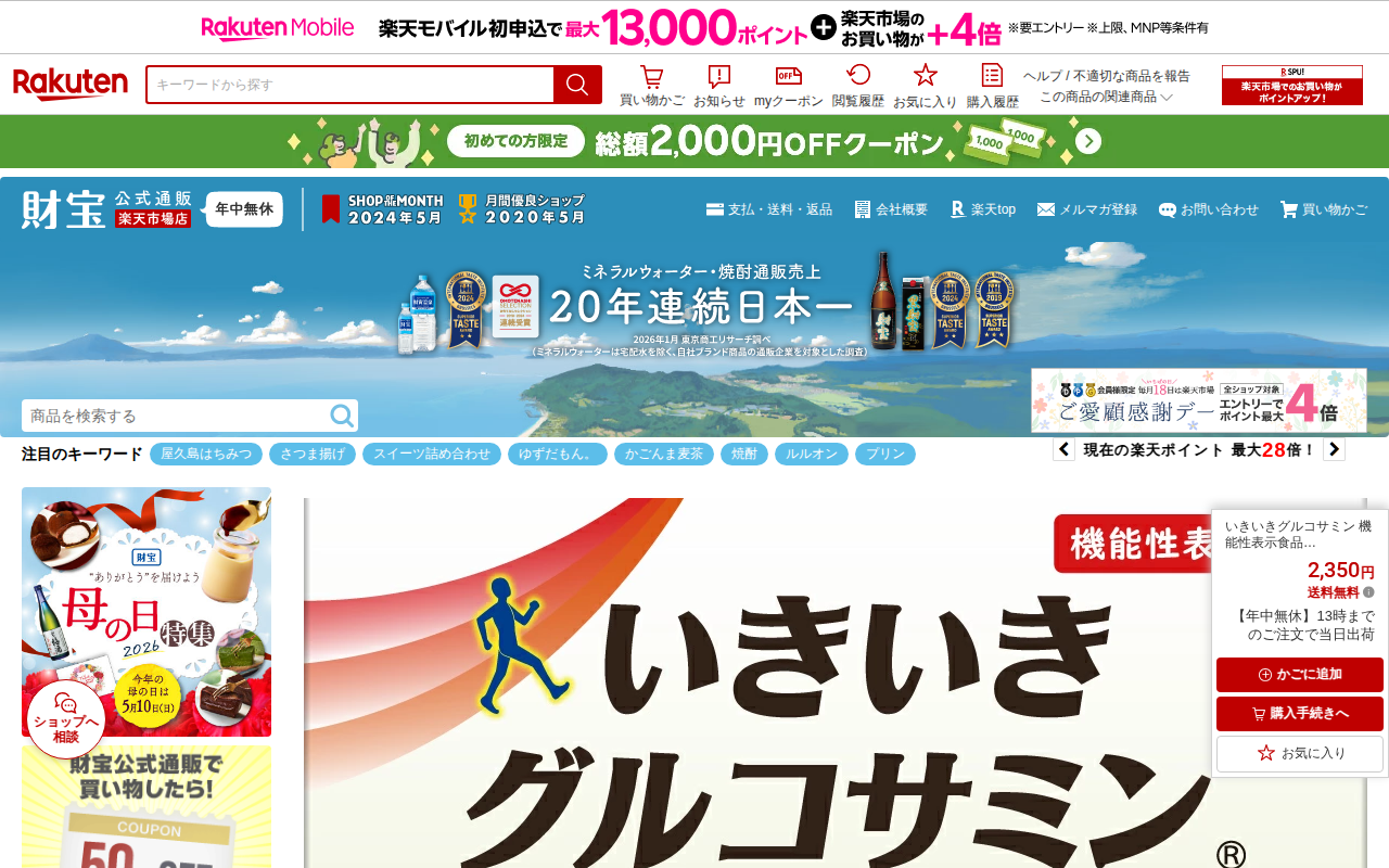 このページは、楽天市場で販売されている「いきいきグルコサミン」という機能性表示食品の商品ページです。1粒300mgで210粒入り、1日7粒目安の約1ヶ月分で2,350円、送料無料です。グルコサミン塩酸塩1,500mgを主...