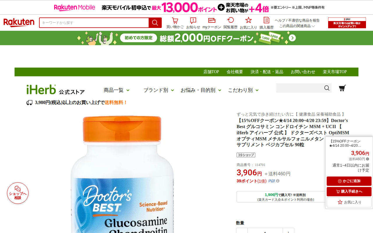 このページはiHerb公式の楽天市場店で販売されているDoctor's Best社のグルコサミン・コンドロイチン・MSM・UCII配合サプリメント(ベジカプセル90粒)の商品ページです。価格は3,906円で、4月14日2...