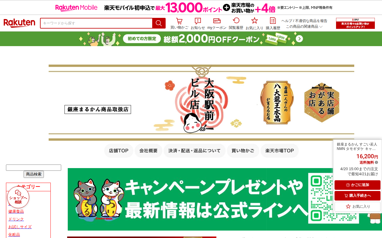このページは、銀座まるかんが販売する「すごい若人」というサプリメント商品の紹介ページです。NMNを2倍配合し、タモギダケ、キャッツクロー、レスベラトロール、ピロロキノリンキノンなど複数の若返り成分を含んでいます。62粒入...