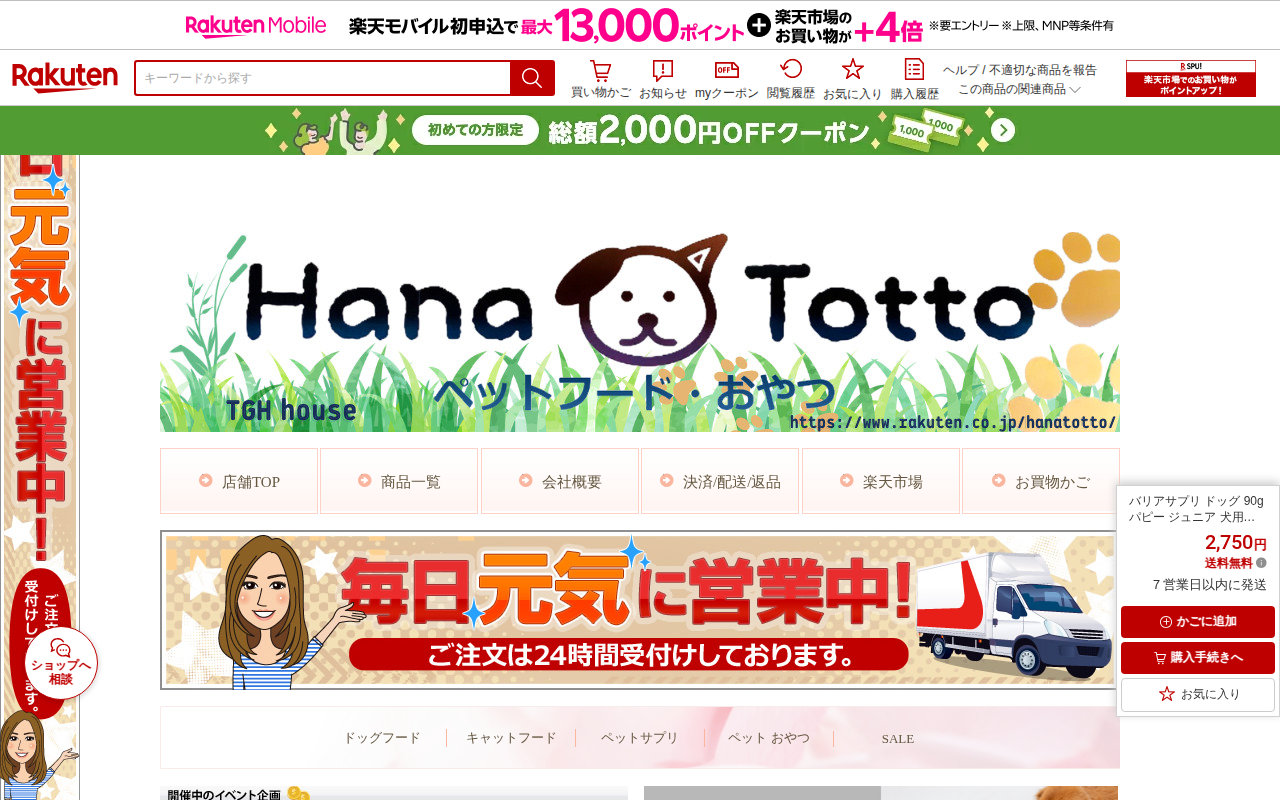 このページは、楽天市場で販売されている犬用サプリメント「バリアサプリ ドッグ」の商品ページです。90gのパピー・ジュニア向け製品で、価格は2,750円、送料無料です。消化器官が未成熟な幼少期の犬の免疫力維持と腸内環境をサ...