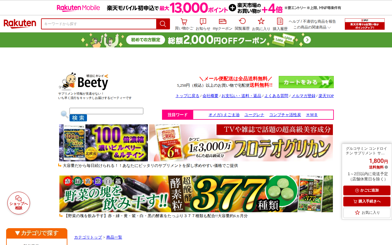 このページは、楽天市場で販売されているグルコサミン・コンドロイチン含有サプリメントの商品ページです。MSMと各種ビタミンを配合した360粒入り(約6ヵ月分)で、価格は1,800円。メール便送料無料で、1~2日以内の発送予...
