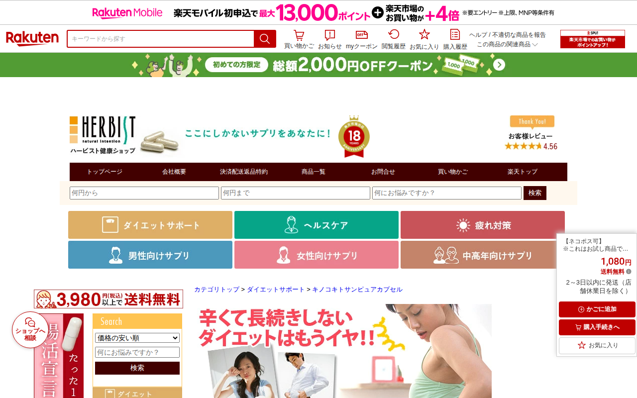 このページは、楽天市場で販売されているキノコキトサンピュアカプセルのお試し商品です。植物性キトサンとβグルカンを含むキノコ成分からなる機能性食品で、飲むだけで腸をコーティングするダイエット補助食品です。辛い食事制限や運動...