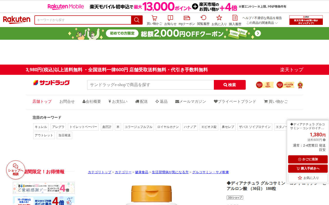 このページは、楽天市場で販売されているディアナチュラのグルコサミン・コンドロイチン・ヒアルロン酸サプリメントの商品ページです。30日分(180粒)で1,380円。グルコサミン1500mg、コンドロイチン100mg、ヒアル...