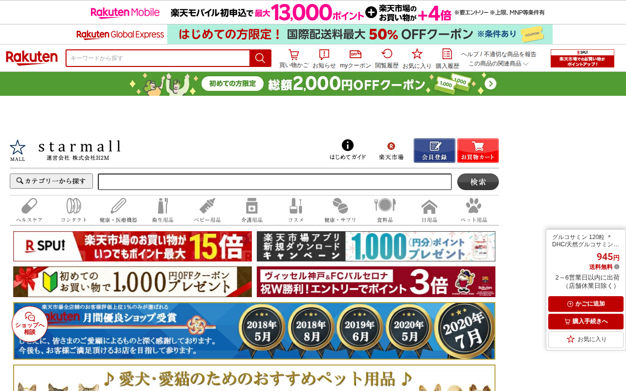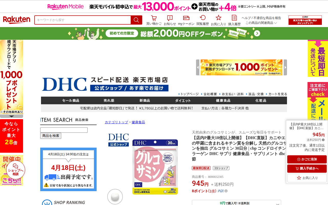 このページは、楽天市場で販売されているDHCのグルコサミンサプリメント商品ページです。120粒入り、945円(送料無料)で、1日6粒を目安に摂取します。天然グルコサミンにII型コラーゲン、コンドロイチン、CBPを配合して...