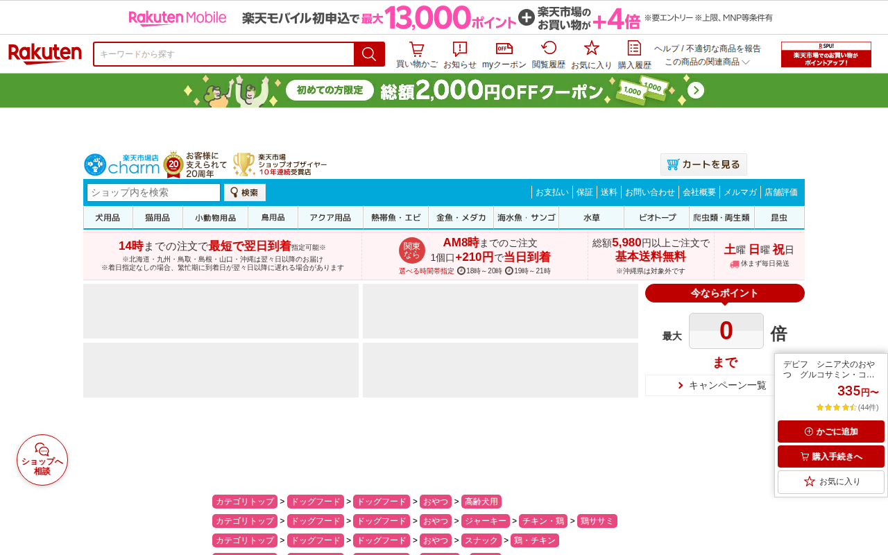 このページは、楽天市場で販売されているデビフ社のシニア犬用おやつの商品情報です。7歳以上の高齢犬を対象とした鶏ささみベースのスナックで、グルコサミン、コンドロイチン、ミルクカルシウム、鶏レバーを配合しています。20g×5...