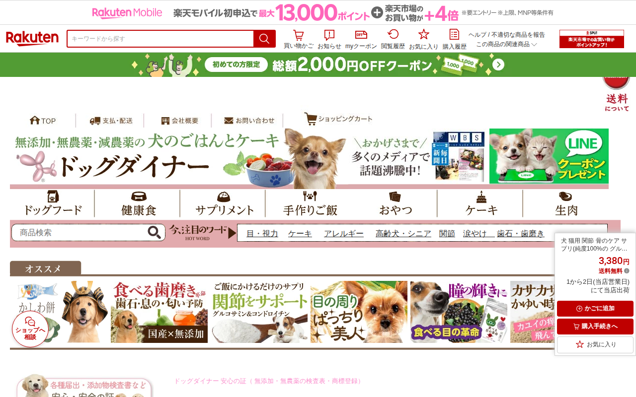 このページは、楽天市場のドッグダイナーで販売されている犬猫用の関節・骨ケアサプリメント商品です。純度100%のグルコサミンを使用した無添加粉末で、3,380円。関節炎や関節痛、足や腰が気になる高齢犬やシニア猫向けです。送...
