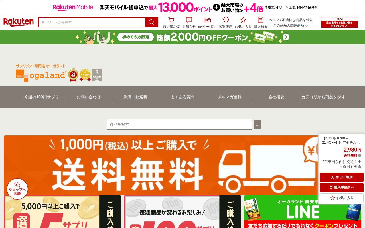 このページは、楽天市場のサプリ専門店オーガランドが販売するN-アセチルグルコサミンサプリメントの商品ページです。約6ヶ月分(250mg×180粒、2個セット)が送料無料で2,980円で提供されており、4月12日朝10時か...