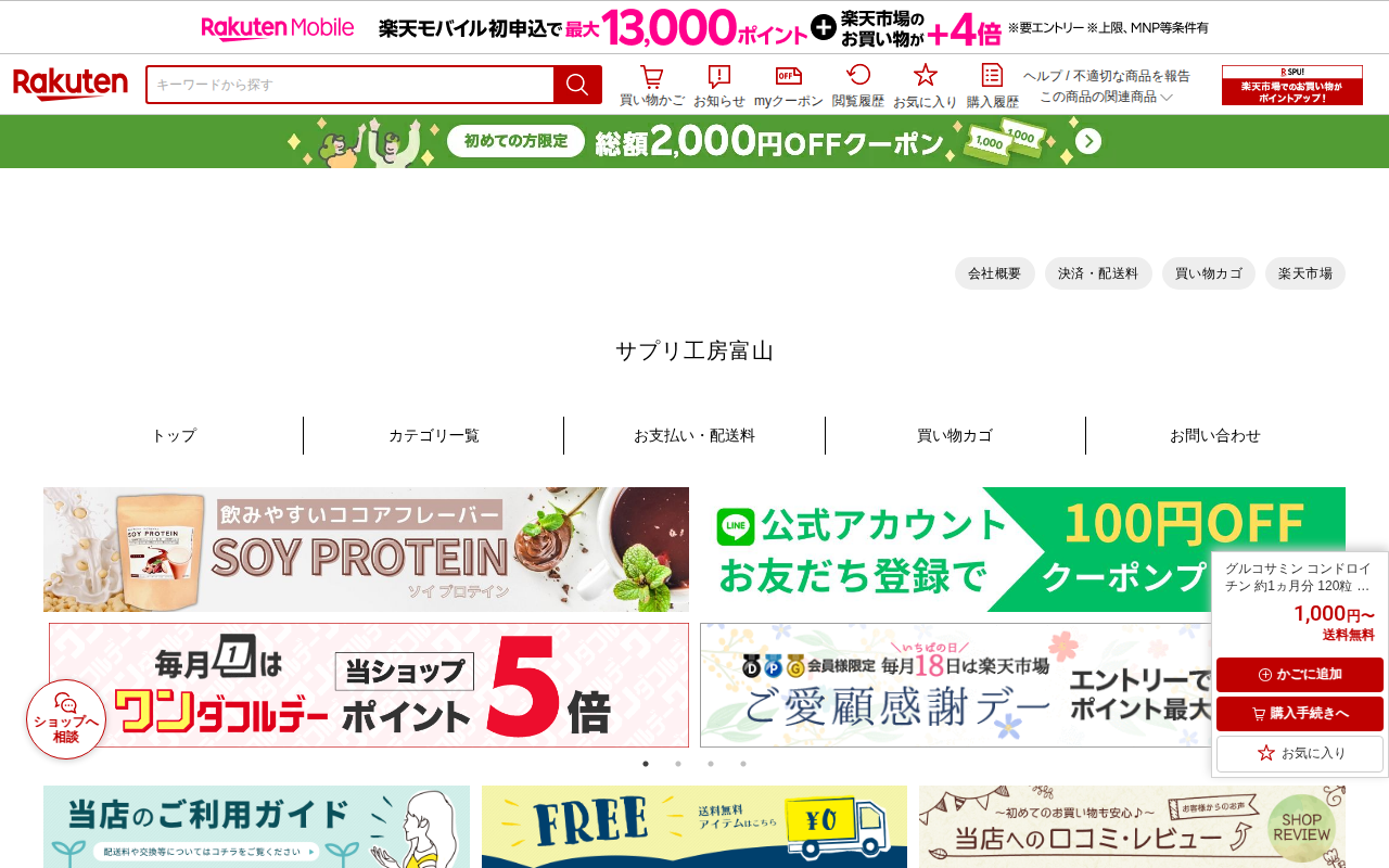 このページは、楽天市場で販売されている「グルコサミンのチカラ」というサプリメント商品の紹介ページです。プロテオグリカン、グルコサミン、コラーゲンなどの軟骨由来成分を配合し、関節や膝の健康をサポートします。天然鮭の鼻軟骨由...