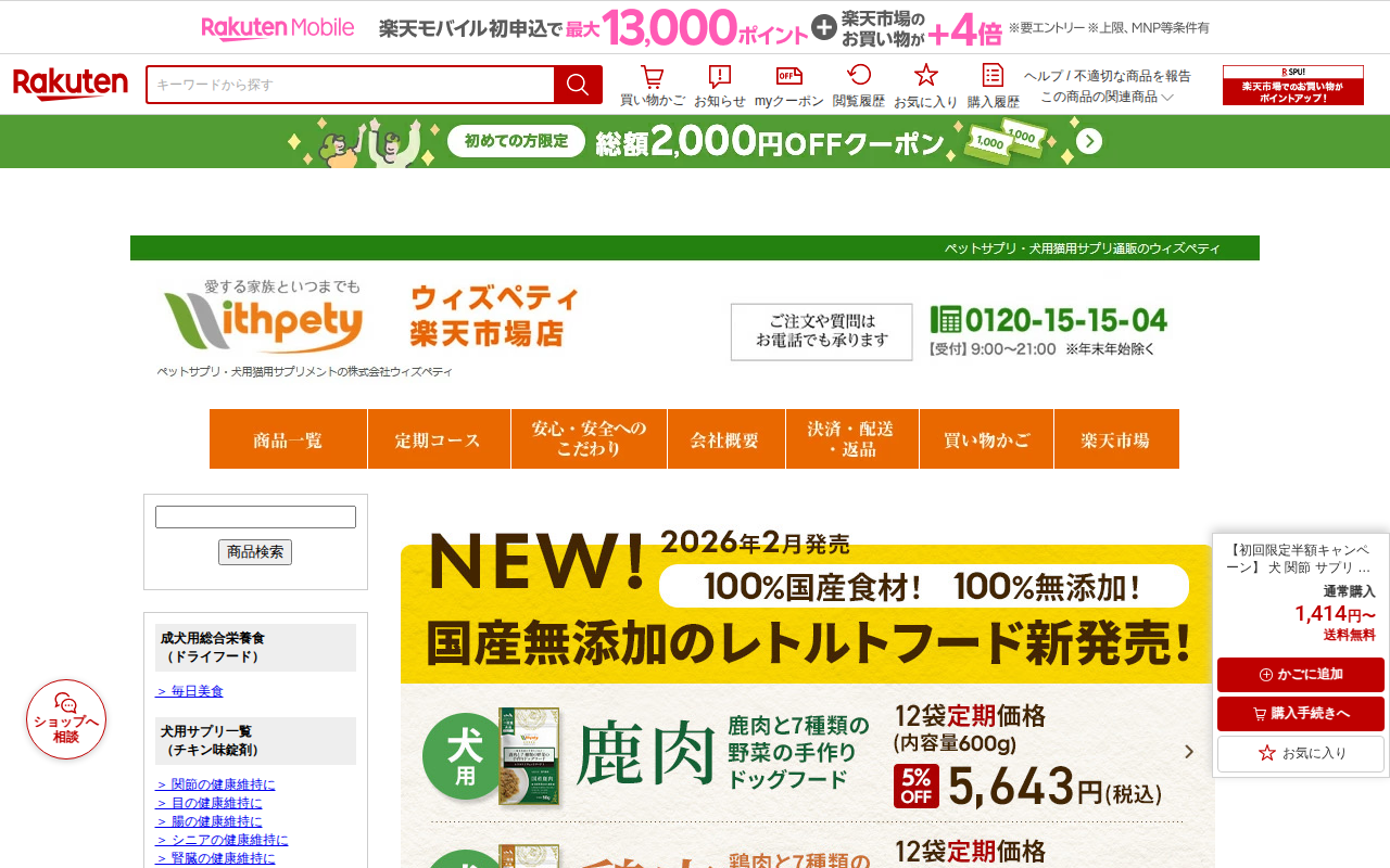 このページは、楽天市場で販売されているウィズペティの犬用関節サプリメント「毎日散歩」の商品紹介ページです。国産無添加のチキン味錠剤で、イミダゾールペプチド、グルコサミン、プロテオグリカン、緑イ貝、コンドロイチンなど8つの...