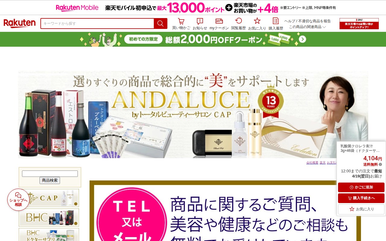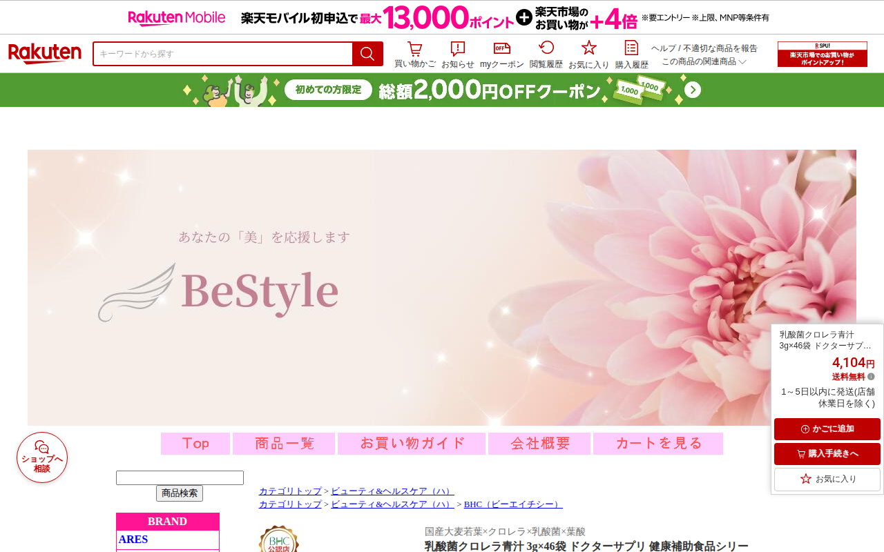 このページは、楽天市場で販売されているBHC製の「乳酸菌クロレラ青汁」の商品ページです。国産大麦若葉、クロレラ、乳酸菌、葉酸を配合した健康補助食品で、3g×46袋入りが4,104円(送料無料)で提供されています。野菜不足...