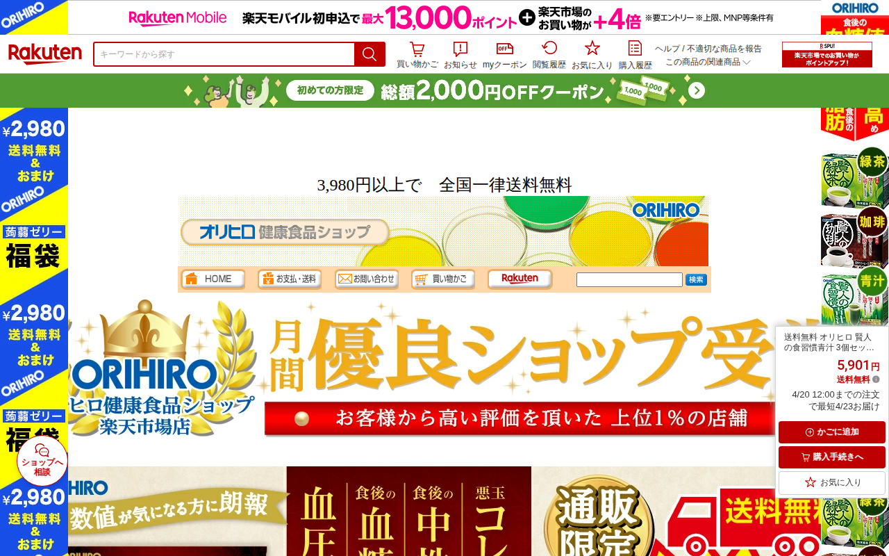 このページは、楽天市場で販売されているオリヒロの「賢人の食習慣青汁」3箱セットの商品紹介です。機能性表示食品であり、食後の血糖値や中性脂肪、血圧が気になる方に適した青汁です。1箱は5g×30本で、3箱セット4,700円(...