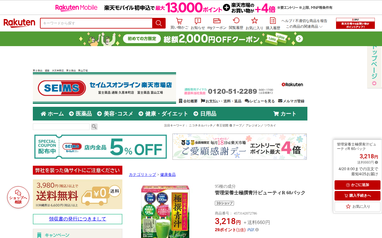 このページは、楽天市場で販売されている「管理栄養士極撰青汁ビューティR 60パック」の商品ページです。95種の成分を含むオールインワン青汁で、美容成分も配合されています。価格は3,218円で、送料は660円(3,980円...