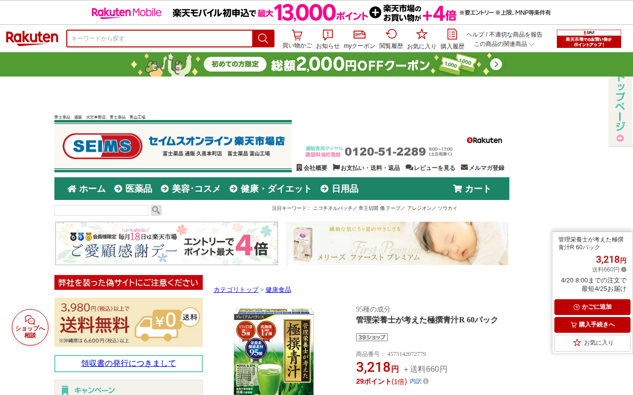 このページは、楽天市場で販売されている「管理栄養士が考えた極撰青汁R 60パック」の商品紹介ページです。価格は3,218円(送料660円)で、95種の成分を含むオールインワン青汁です。大麦若葉を主成分とし、野菜粉末、乳酸...