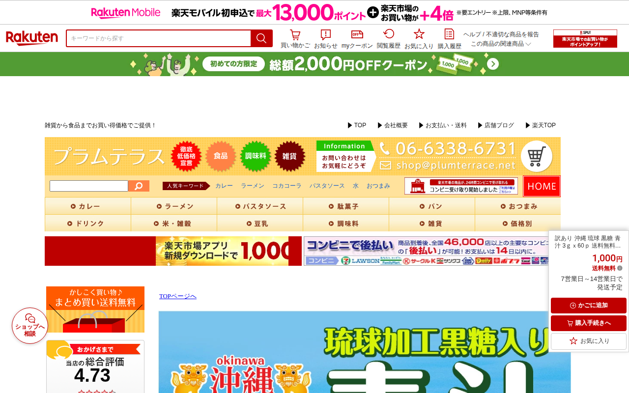 このページは、楽天市場で販売されている沖縄産の黒糖青汁商品の紹介ページです。大麦若葉にゴーヤとケール粉末を加え、黒糖風味にした青汁で、3g×60包、送料無料で1,000円です。訳あり商品のため簡易包装(PP袋発送)となっ...
