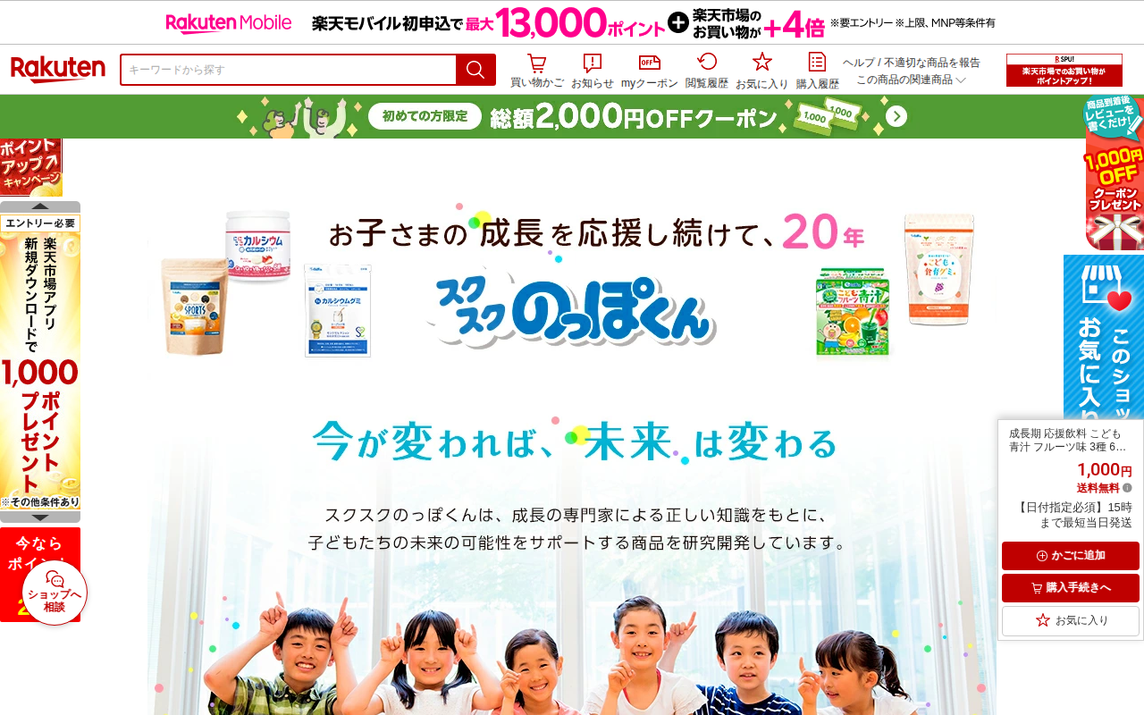 このページは、楽天市場で販売されている「こども青汁 フルーツ味」の商品ページです。成長期の子どもを応援する飲料で、野菜嫌いや偏食の子ども向けに開発されました。九州産の大麦若葉を使用し、カルシウム、鉄分、ビタミンD、DHA...