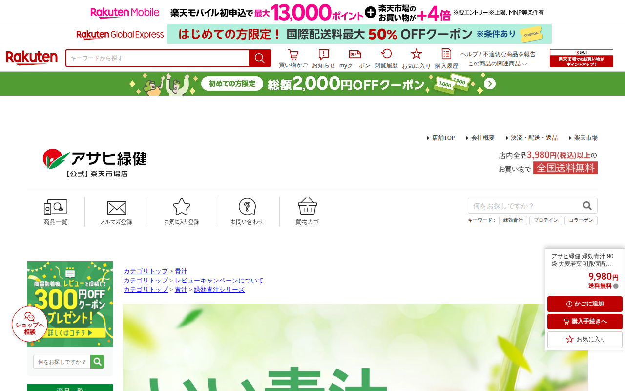 このページはアサヒ緑健の緑効青汁90袋入り商品の楽天市場での販売ページです。大麦若葉を使用した粉末青汁で、乳酸菌、オリゴ糖、食物繊維のバランスで健康をサポートします。特許技術のゴールデンバランスにより、トリプル乳酸菌・食...