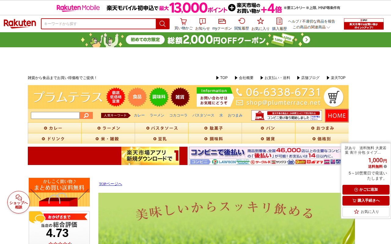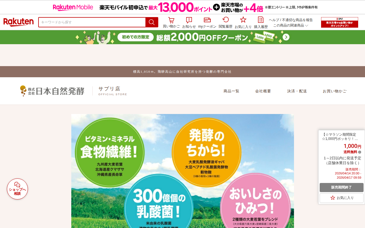 このページは、楽天市場で販売されている「おいしい発酵青汁」のお試し商品です。300億個の乳酸菌を含む国産大麦若葉と美濃白川茶を使用した粉末青汁で、3g×10包(約10日分)が1,000円で送料無料。マラソン期間限定の販売...