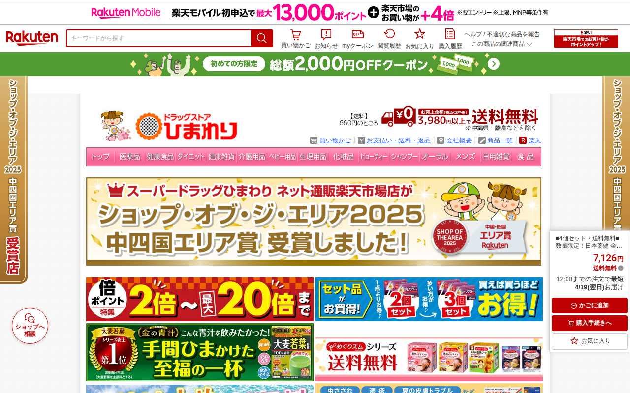 このページは、楽天市場で販売されている日本薬健の「金の青汁」3個セットの商品ページです。九州産の大麦若葉を100%使用した純国産青汁で、無農薬栽培された原料を収穫から24時間以内に加工しています。副原料や添加物は一切無添...
