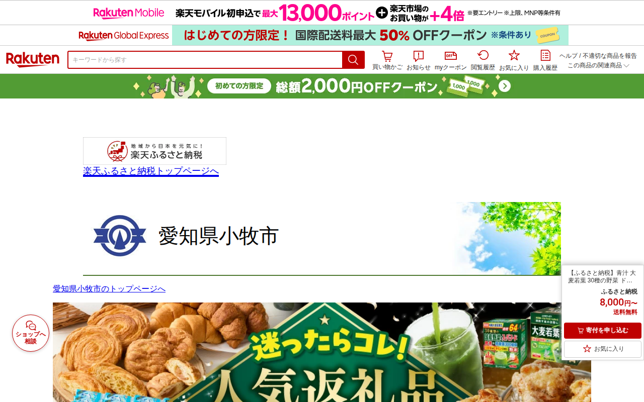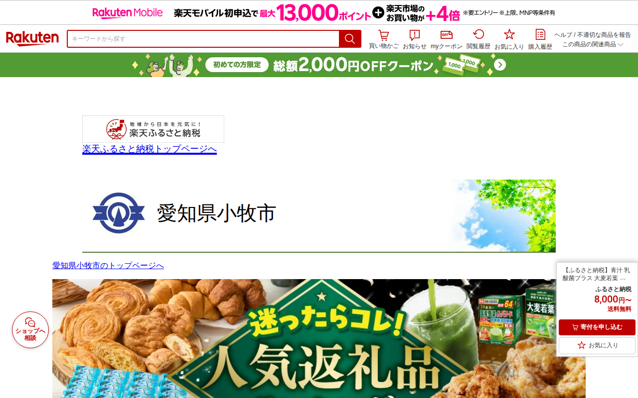 このページは、愛知県小牧市のふるさと納税返礼品として提供される青汁商品を紹介しています。山本漢方製薬による大麦若葉粉末100%が3g×154スティック入りで、ドラッグストア売上No.1の商品です。単品1回購入、または乳酸...