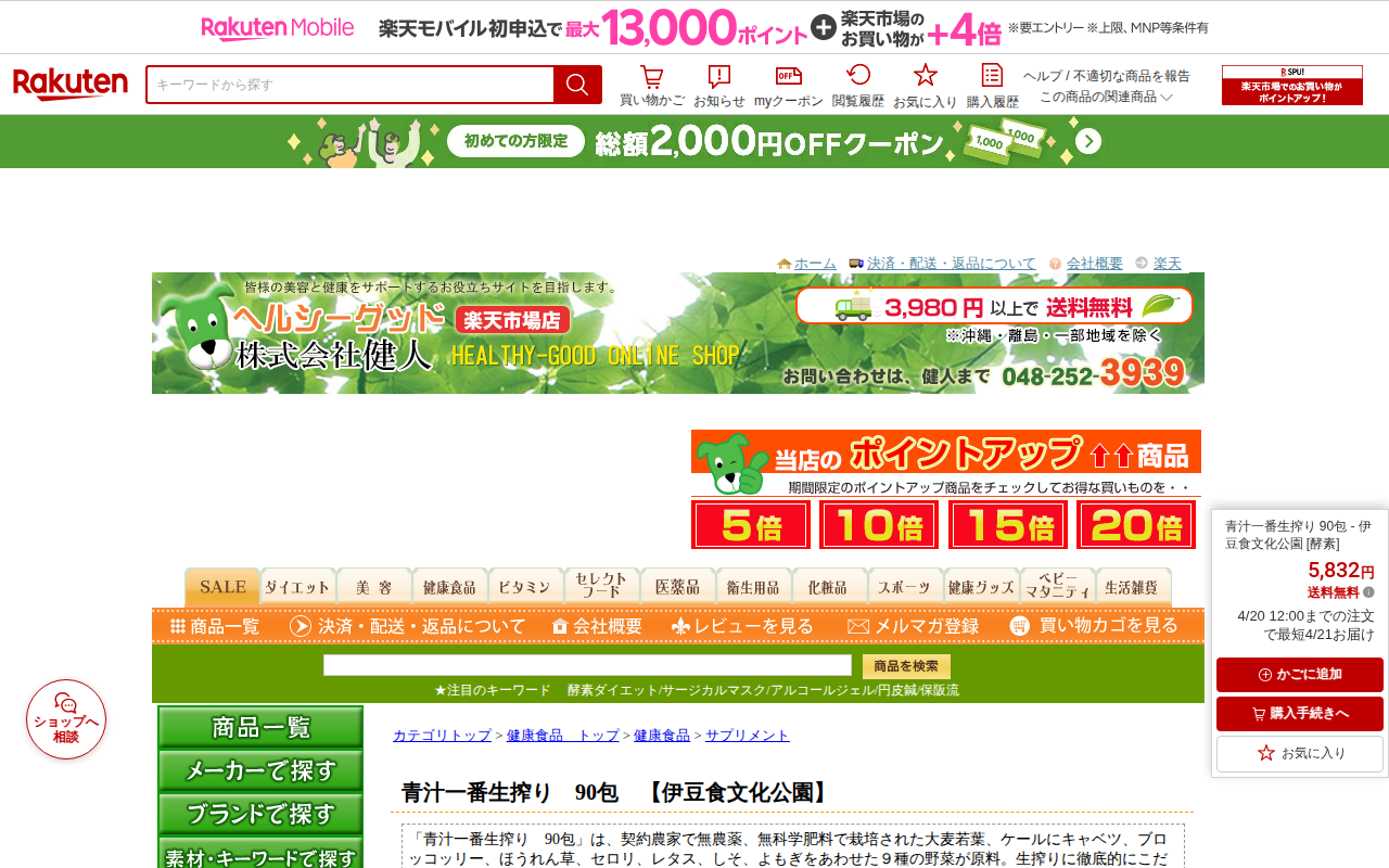 【楽天市場】青汁一番生搾り 90包 - 伊豆食文化公園 [酵素]:ヘルシーグッド 楽天市場店