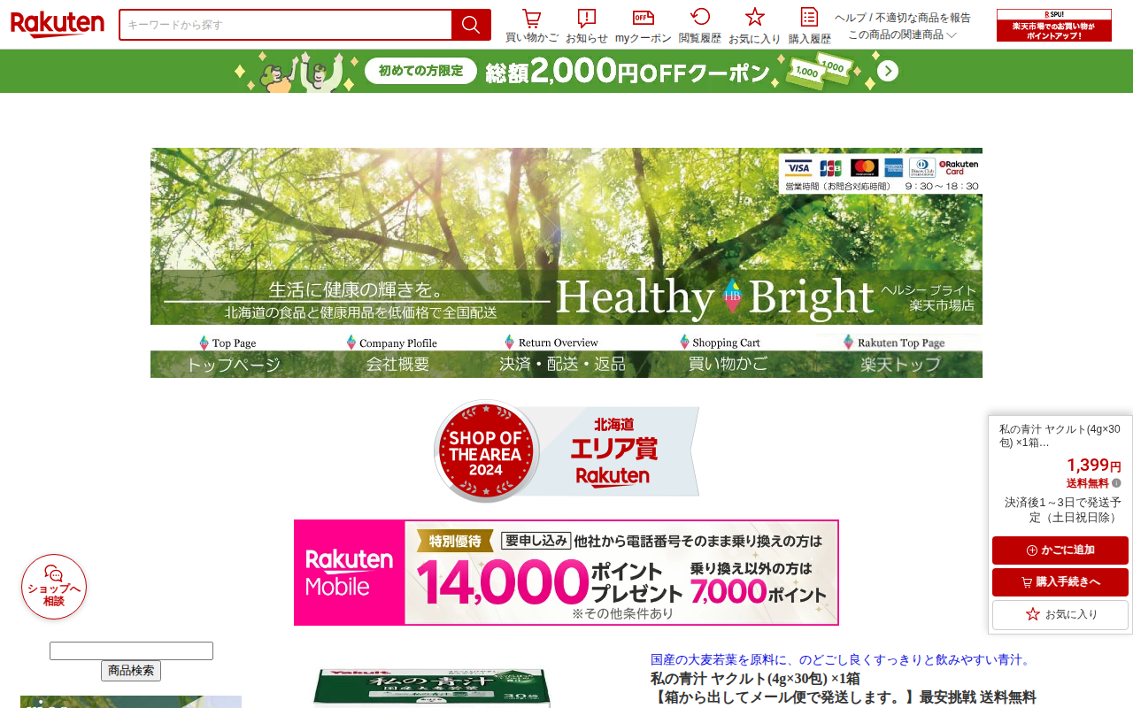 このページは、楽天市場で販売されているヤクルトの「私の青汁」の商品ページです。国産大麦若葉を使用した個包装粉末タイプの青汁で、4g×30包入り、価格は1,399円(送料無料)です。1日1~2袋を目安に水やお湯、牛乳などに...