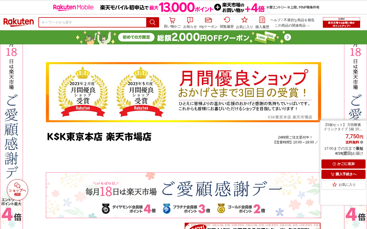 このページは、楽天市場で販売されている万田酵素ドリンクタイプの5個セット商品の販売ページです。1箱10本入り(50ml×10本)で、価格は7,750円、送料無料です。万田酵素のペースト1包分相当を配合した飲みやすいドリン...
