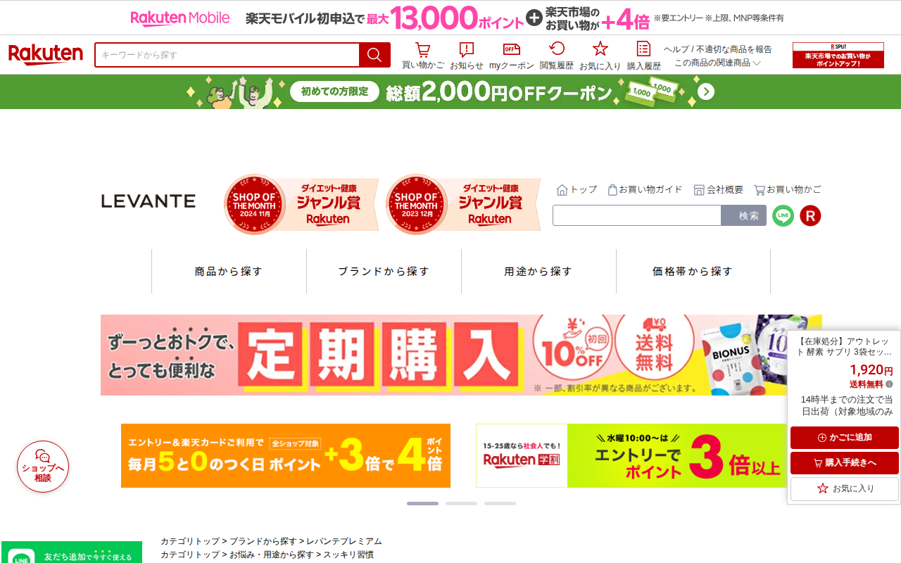 このページは、楽天市場で販売されているレバンテプレミアム酵素サプリの在庫処分アウトレット品です。3袋セット1,920円(1袋あたり640円)で、30日分の酵素サプリメント。野菜酵素375種、米麹、炭、チャコール、酪酸菌、...