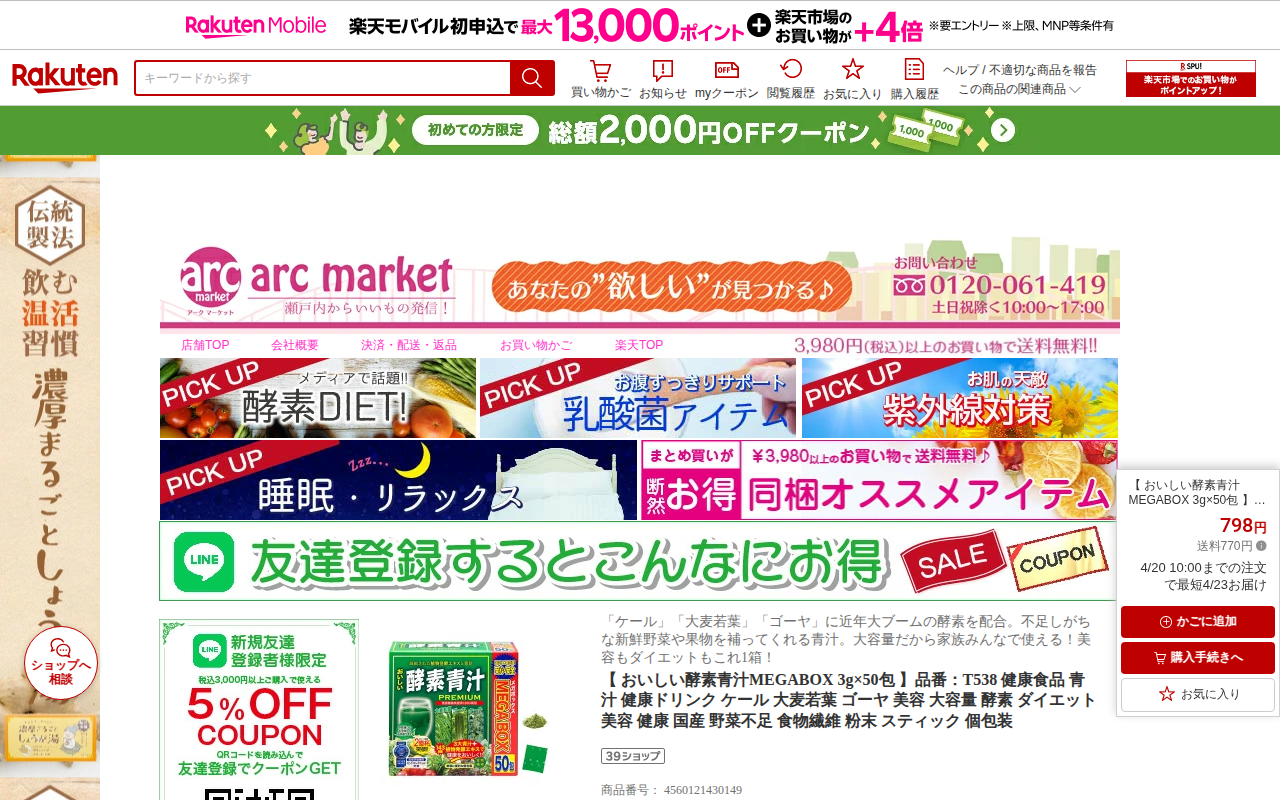 【楽天市場】【 おいしい酵素青汁MEGABOX 3g×50包 】品番:T538 健康食品 青汁 健康ドリンク ケール 大麦若葉 ゴーヤ 美容 大容量 酵素 ダイエット 美容 健康 国産 野菜不足 食物繊維 粉末 スティック 個包装:arc market