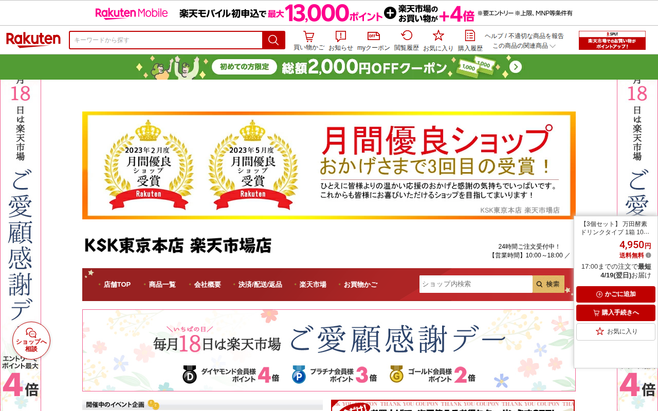 このページは、楽天市場で販売されている万田酵素ドリンクタイプの3個セット商品の紹介ページです。1箱10本入り、1本50mlで38kcalの飲みやすい酵素ドリンクです。価格は4,950円で送料無料、翌日配送対応です。ペース...