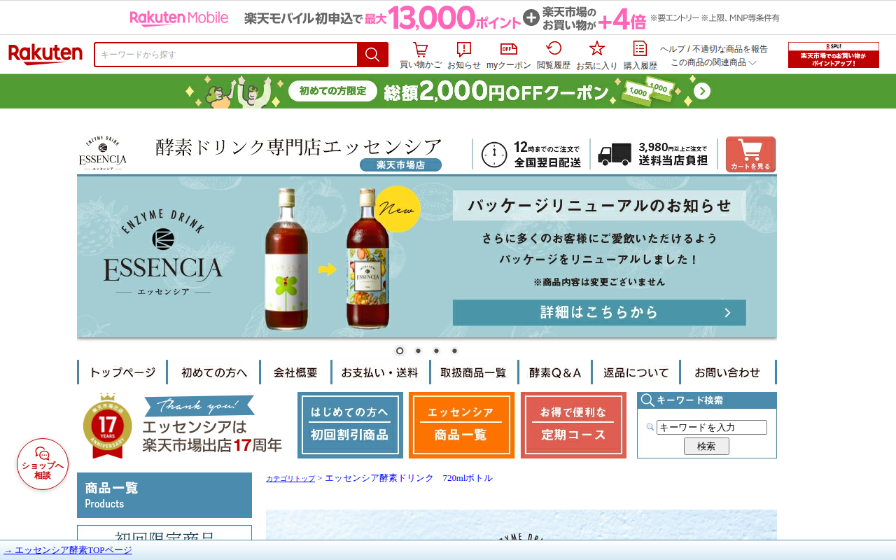 このページは、楽天市場で販売されているエッセンシア酵素ドリンク720mlボトルの商品ページです。完全無添加で美味しい酵素ドリンクで、1本で約18日間の置き換えダイエットが可能です。ファスティングやプチ断食、腸活に対応し、...