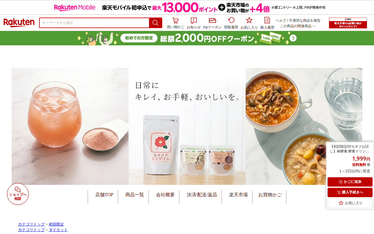 このページは、楽天市場で販売されている「カメリアエンザイム」という酵素ドリンク粉末商品の商品ページです。初回限定で50%オフの1,999円(送料無料)で購入できるお試し商品となっています。133種類の植物を発酵させた酵素...