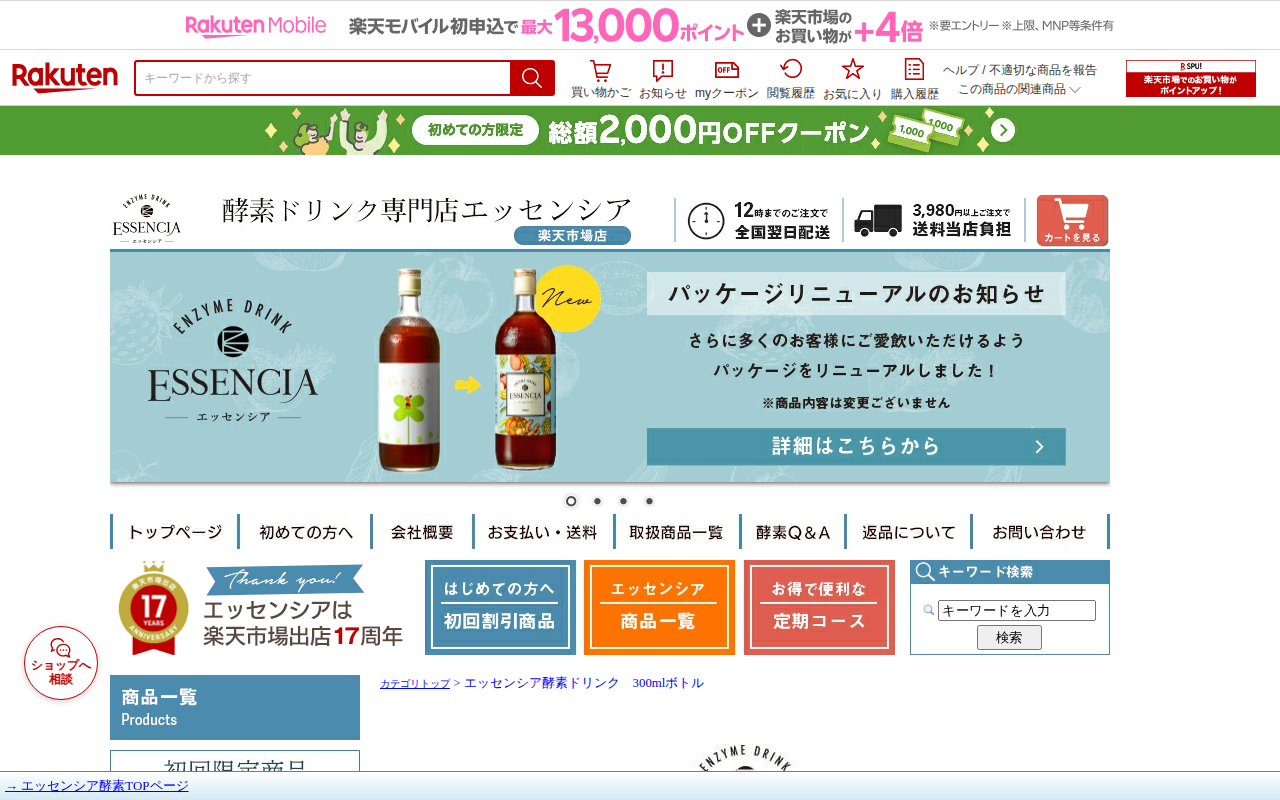 このページは、楽天市場で販売されているエッセンシア酵素ドリンク300mlボトルの商品ページです。販売開始から18年以上の実績を持つ、完全無添加の酵素ドリンクを扱っています。初回限定で10%OFFの価格4,547円で購入で...