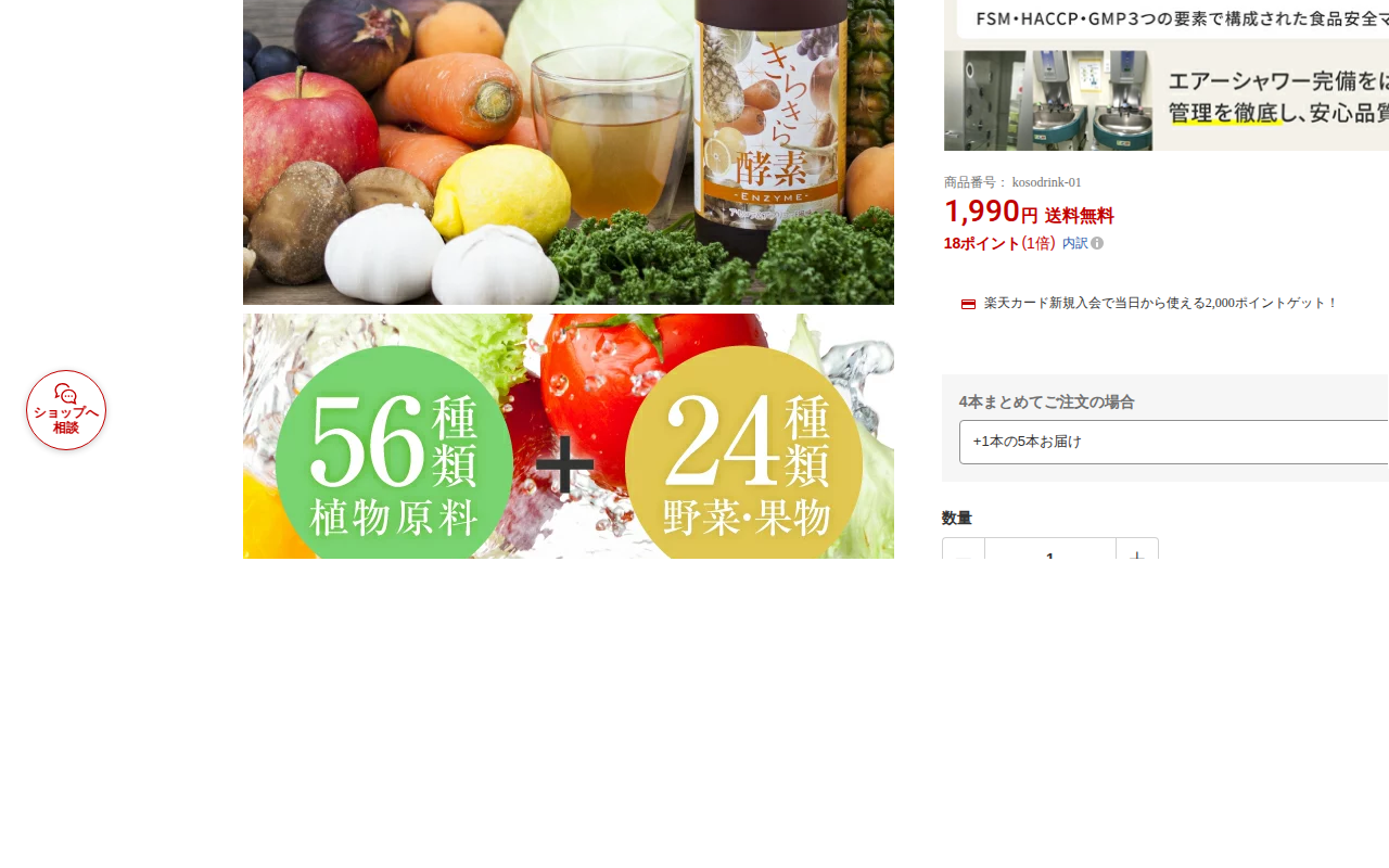 このページは、楽天市場で販売されているきらきら酵素ドリンク720mlの商品ページです。酵素、プラセンタ、レスベラトロールを配合した清涼飲料水で、ダイエットやファスティング、酵素サプリをお探しの方向けです。価格は1,990...