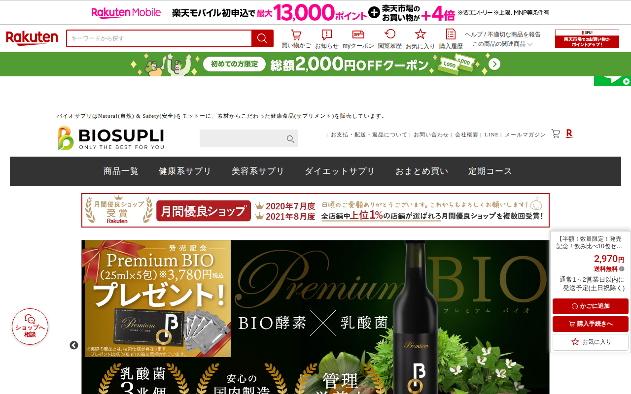 このページは、楽天市場で販売されているバイオサプリの酵素ドリンク「Premium BIO & BIO酵素」の飲み比べ10包セットの商品紹介ページです。発売記念特別価格で通常5,940円から半額の2,970円で販売されてお...