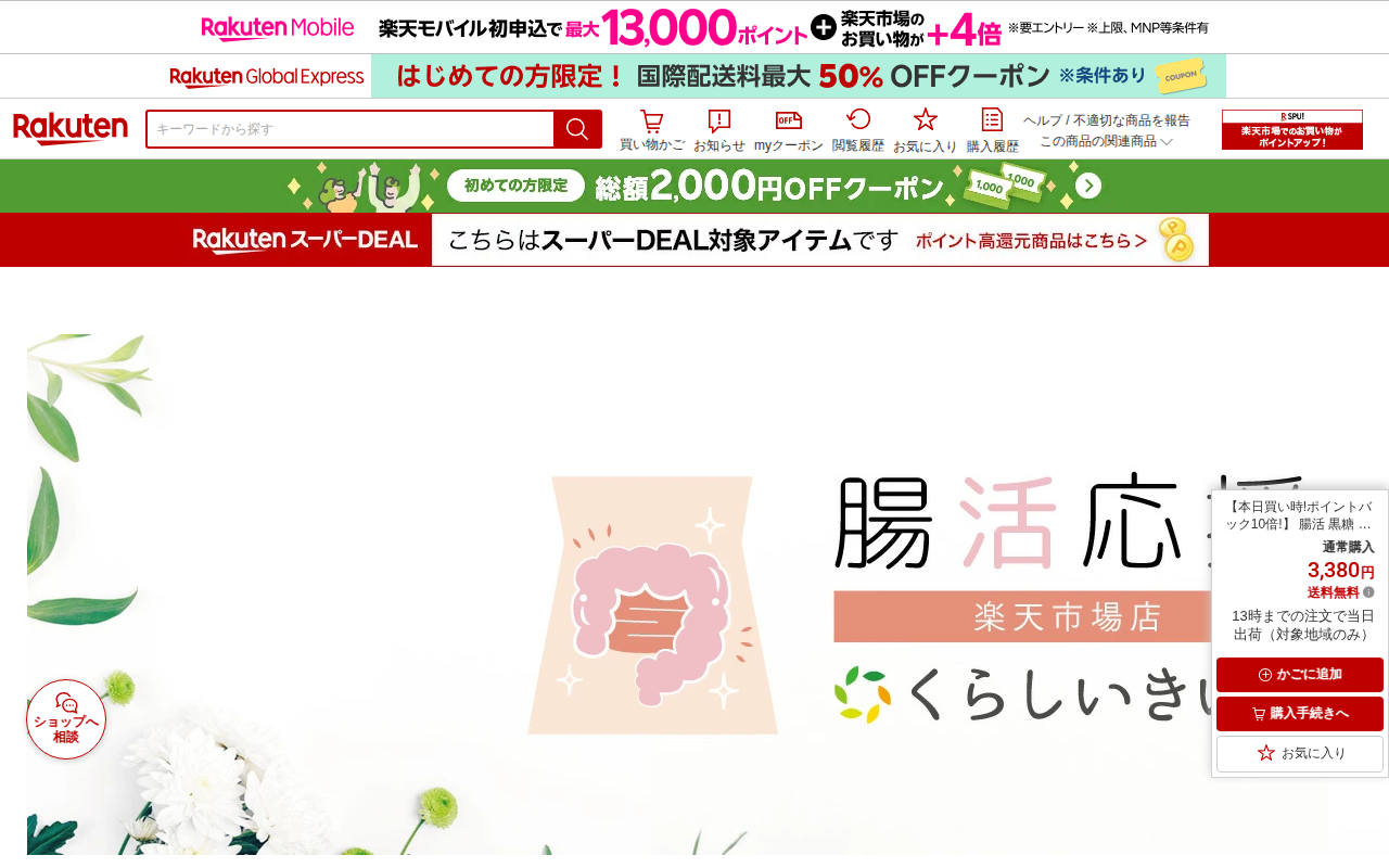 このページは、楽天市場で販売されている「玄米麹スムージー黒糖きなこ味」の商品紹介です。3,380円で、朝食や一食の置き換えダイエットに適した粉末スムージーです。鹿児島産の玄米麹を使用し、人工甘味料・香料・保存料・着色料・...