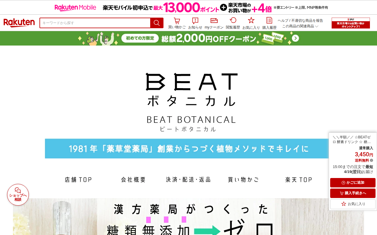 このページはBEATゼロ酵素ドリンクの楽天市場商品ページです。糖類無添加で、ダイエット・ファスティング・クレンズをサポートする酵素ドリンク720mlが、通常価格6,900円から半額の3,450円で販売されています。漢方薬...