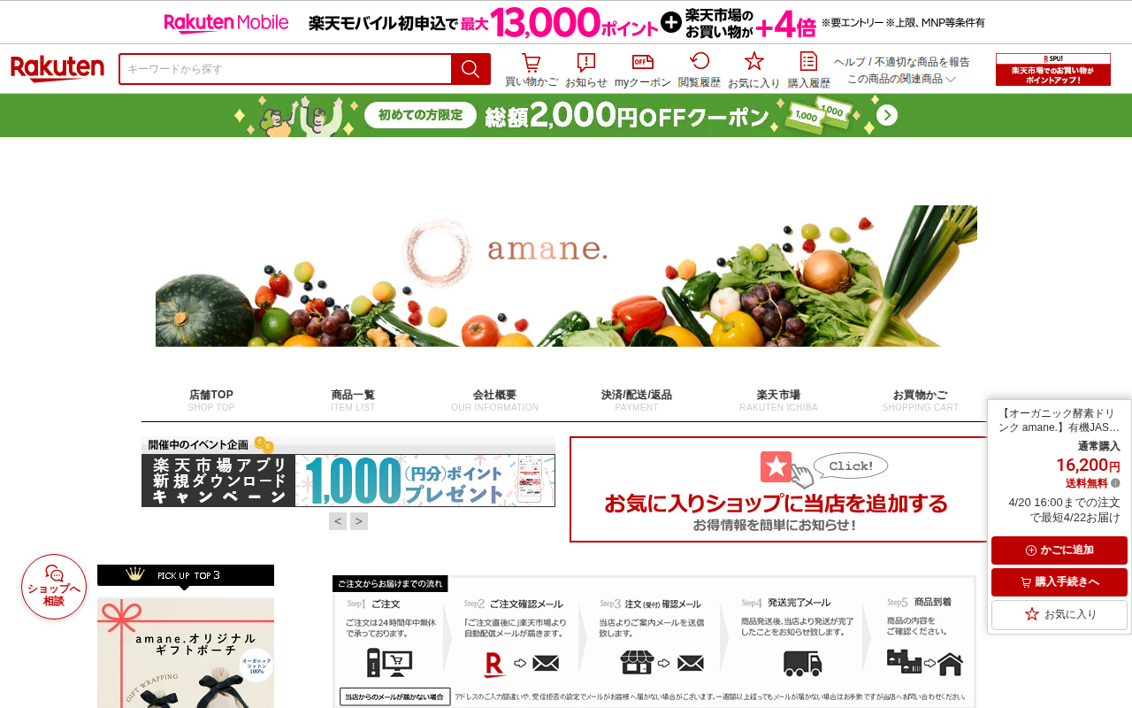 このページは、楽天市場で販売されているオーガニック酵素ドリンク「amane.」の商品ページです。有機JAS認証、無農薬、無化学肥料の植物発酵エキス飲料で、フルボ酸やミネラルを含んでいます。腸活、デトックス、ファスティング...