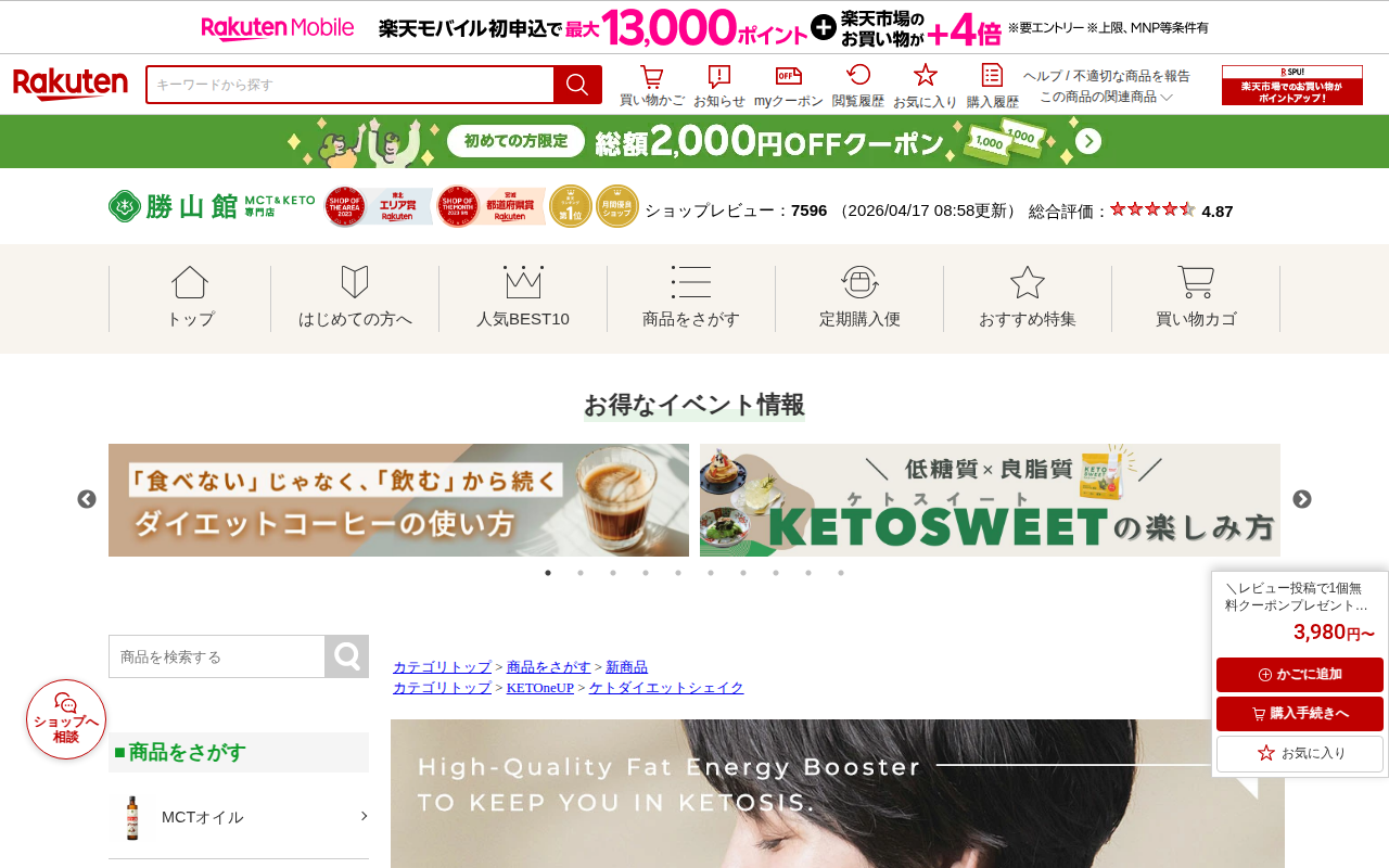 【楽天市場】\レビュー投稿で1個無料クーポンプレゼント/ケトダイエットシェイク ミルクティー味 210g KETOneUP |1週間 置き換えダイエット MCTオイル 入りで 腹持ち UP! 1食 置き換え で効率的に ダイエット |ダイエットシェイク プロテイン 男性 女性:MCT&KETO専門店 勝山館