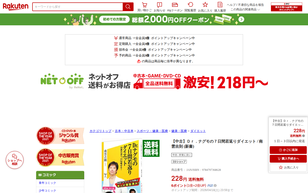 このページは、楽天市場のネットオフ送料がお得店で販売されている中古書籍「Dr.ナグモの7日間若返りダイエット」(著者:南雲吉則、ソフトバンク新書)の商品情報ページです。228円で送料無料、1~3日以内に発送予定となってお...