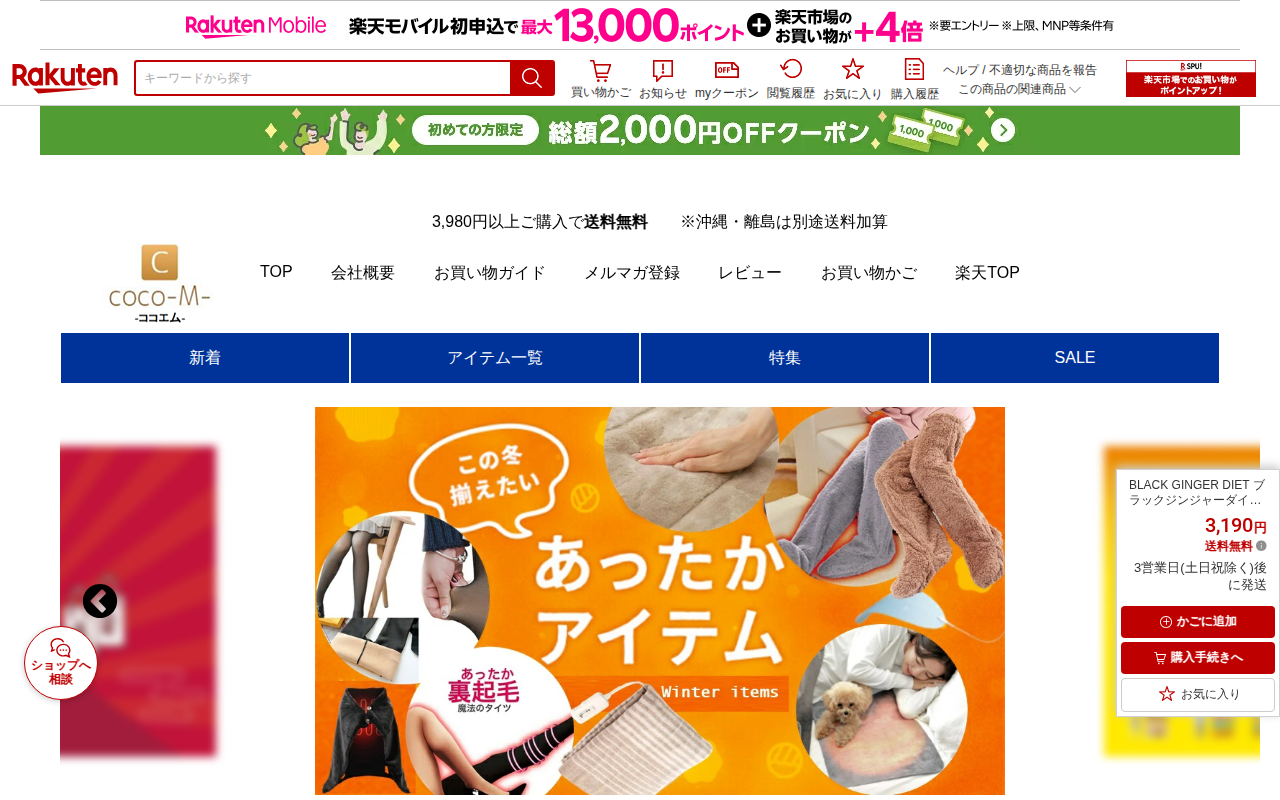このページは、楽天市場で販売されている「BLACK GINGER DIET ブラックジンジャーダイエット」というダイエットサプリメントの商品ページです。価格は3,190円で送料無料、3営業日後に発送されます。内容量は15...